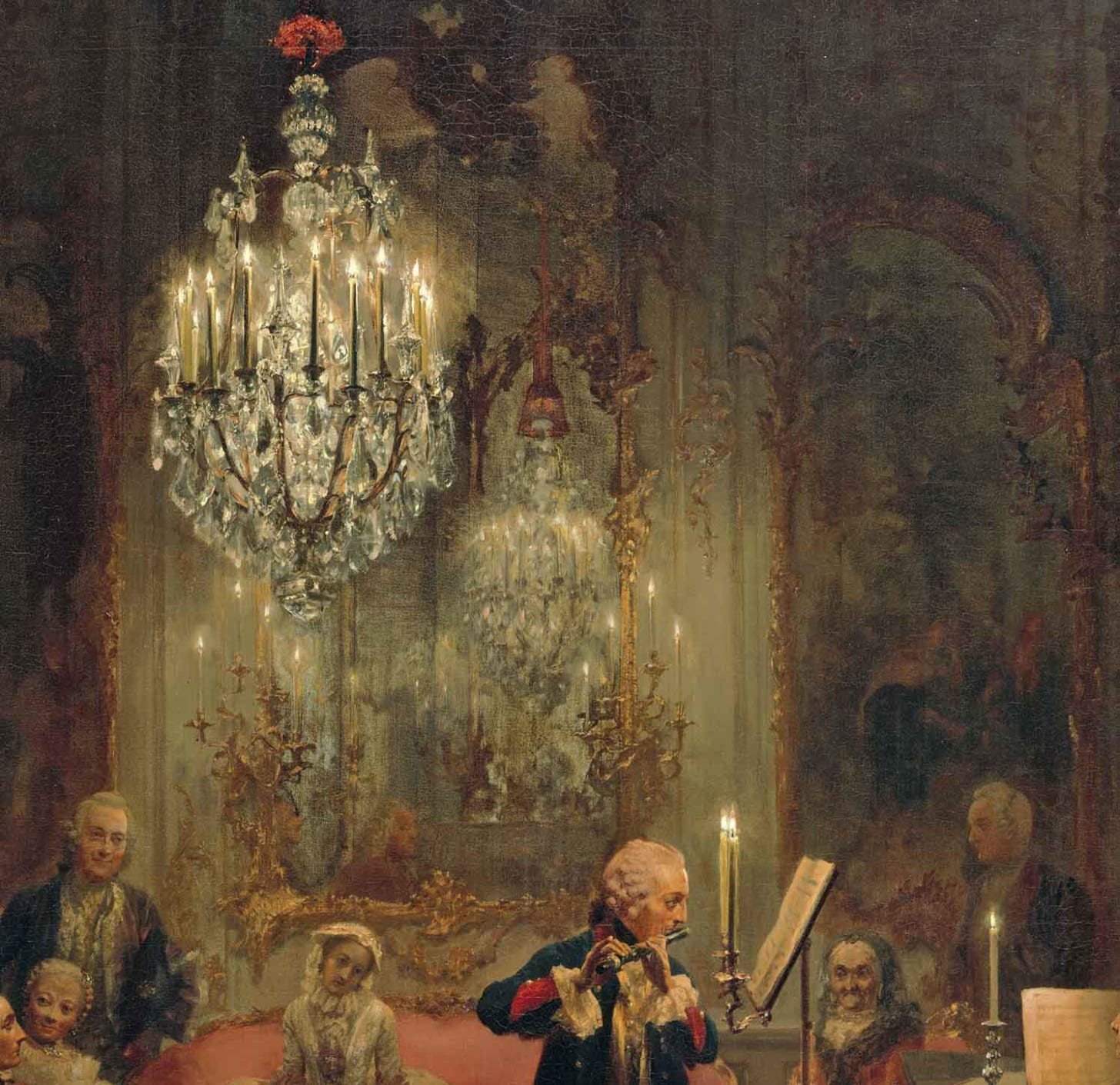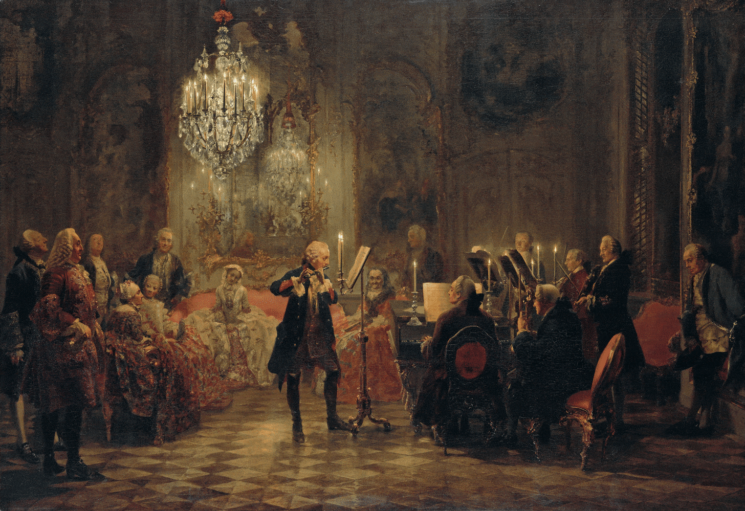 En el centro aparece la figura idealizada de Federico II de Prusia: el primer músico amateur del reino. La figura del rey se destaca no solo por su posición central y su iluminación, sino también por el tratamiento compositivo que lo separa ópticamente del resto de los intérpretes mediante el atril alto y el espacio vacío a su alrededor.
