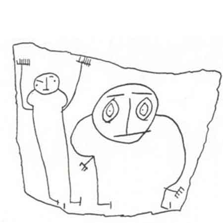Aquí aparecen Onfim y su profesor. Llama la atención el número diferente de dedos en las manos-rastrillos de las figuras, lo que indica que quizá Onfim no había aprendido a contar aún.